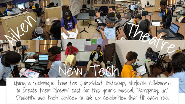 Several JumpStart Theatre schools have had great success incorporating their rehearsals and theatre activities and techniques into the classroom. Kara Barbee, a teacher at Aiken New Tech High School in Cincinnati, organized a fun activity for her class, inspired by the methods she learned in a JumpStart Theatre bootcamp. Students read the script of the musical, then created their own celebrity dream casts. She created a collage to share their efforts:
